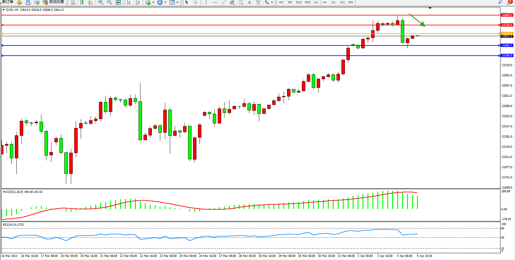 道琼斯指数4月4日(周二)收盘下跌198.11点,跌幅0.59%,报33403.04点;市场开始预期美联储将采取稳健的货币政策,以保障美国经济不陷入衰退。市场认为,美联储在5月份加息25个基点的可能性超过60%,但今年晚些时候降息的可能性也同时上升。