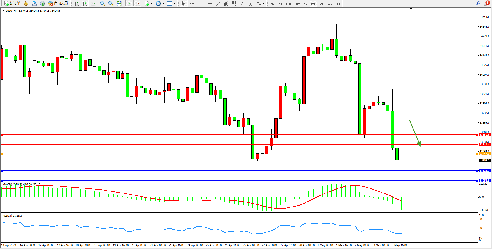 道琼斯指数5月3日(周三)收盘下跌270.42点,跌幅0.80%,报33414.11点;美联储公布最新的5月利率决议,美联储加息25基点,至5.00-5.25%。美联储本次决议措辞较为中性,市场认为美联储接下来将暂停本轮加息。目前市场焦点转向稍后的美联储主席鲍威尔的讲话。