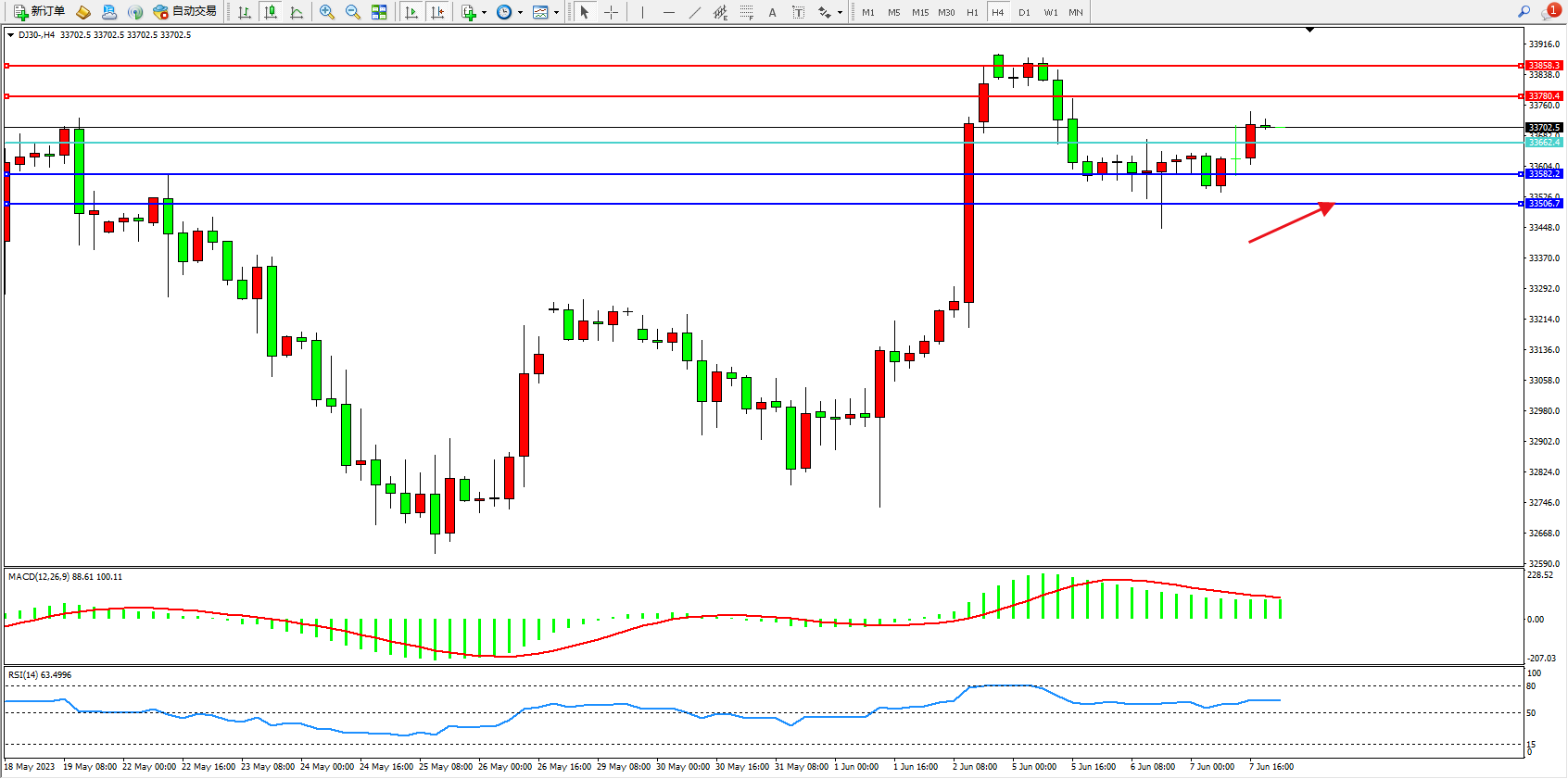 道琼斯指数6月7日(周三)收盘上涨92.76点,涨幅0.28%,报33666.04点;随着进口回升和出口下降,美国4月份贸易逆差扩大至六个月来的最大水平。公布的数据显示,美国商4月品和服务贸易逆差为746亿美元,较上月增加140亿美元,增幅为23%。商品和服务进口额增长1.5%,至3236亿美元,而出口则下降了3.6%,至2490亿美元。